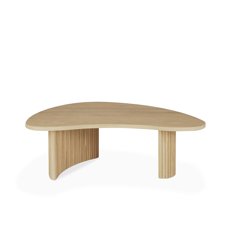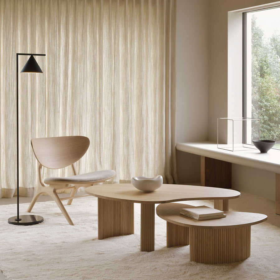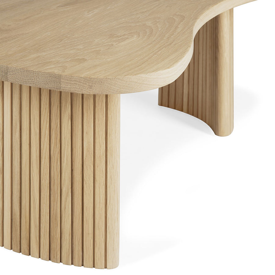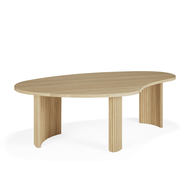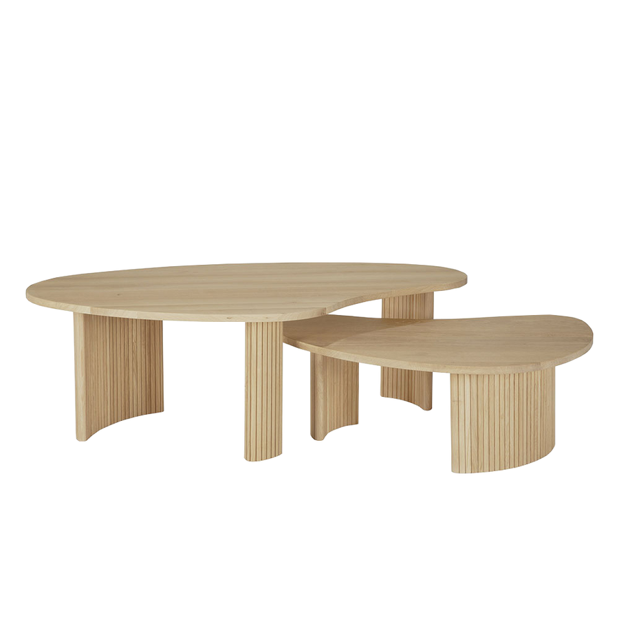 Featuring a smooth asymmetric shaped tabletop over stacked wood-stick effect legs, the Boomerang coffee tables from Ethnicraft furniture are made from solid sustainable Oak with a light oil finish. Available separately in two sizes to fit most spaces, they can also be used together as a nesting / overlapping pair.