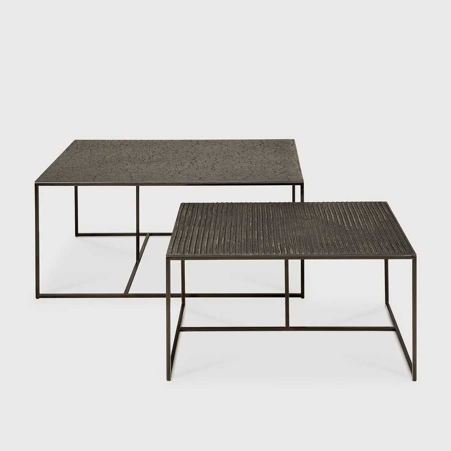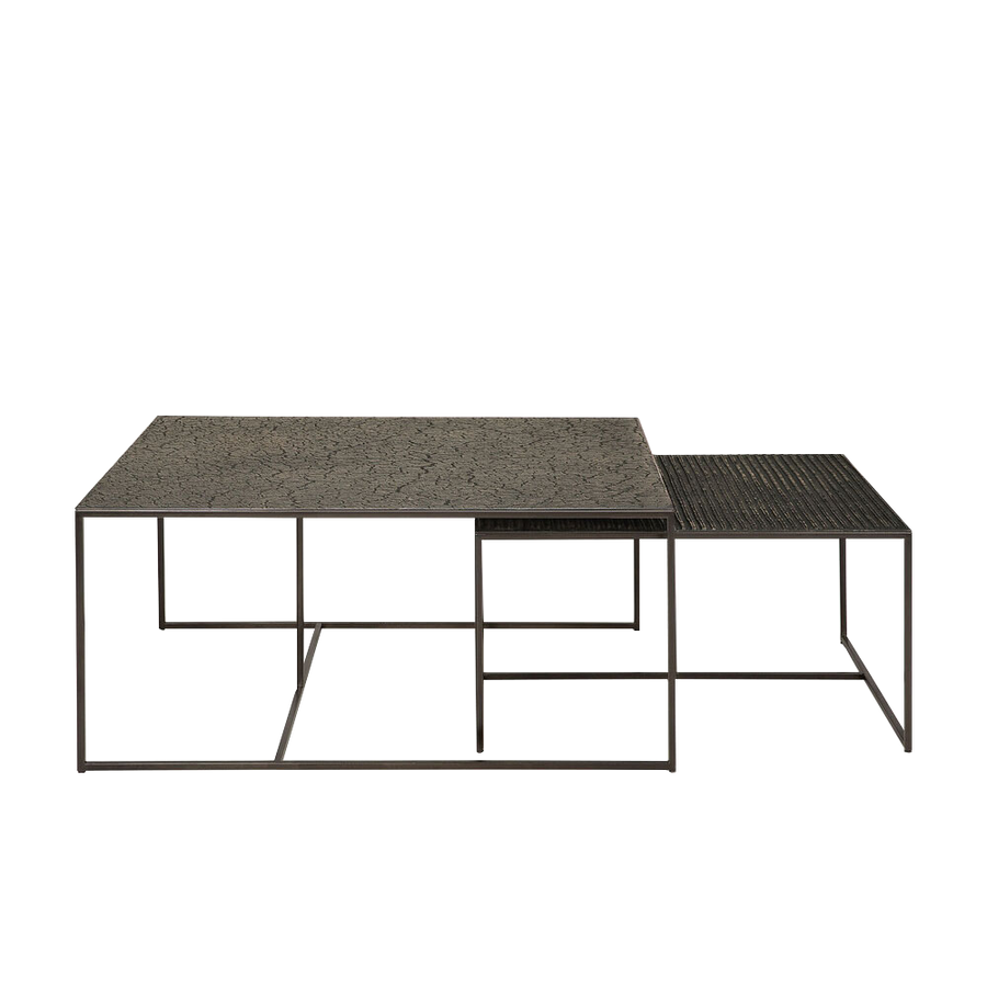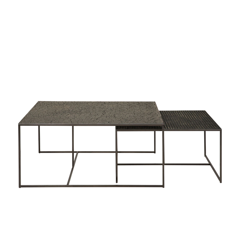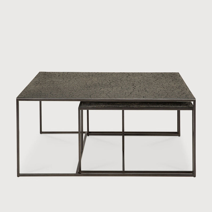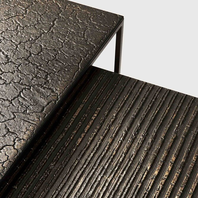 A hand applied unique surface and refined metal framework give form to a beautiful set of tables. Sold as a set of two, the lower table will nestle away if not needed, or looks stunning staggered out. The distinctive top finishes are made from mineral powders, water, earth, natural colour pigments and metallic powders to form a crackled lava like brown/bronze finish called Whiskey, further interest is added with the lower table surface where the lava is formed into a linear pattern. Clean lines showcase the simple beauty of the black metal work against the textured tops. An visually interesting statement coffee table.