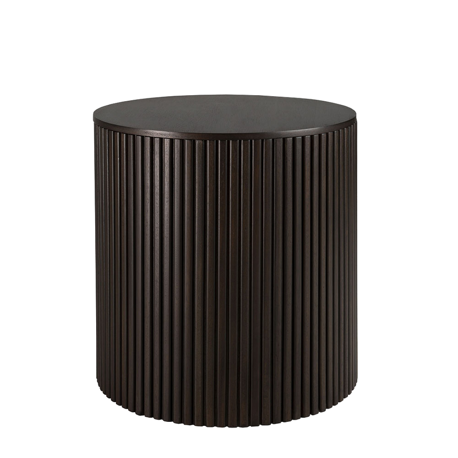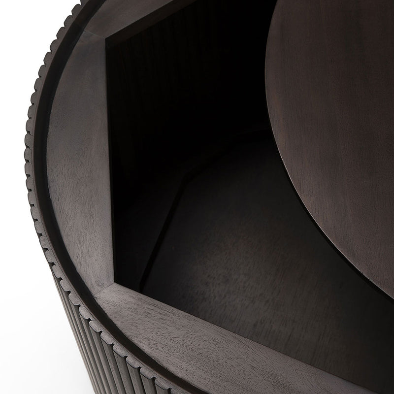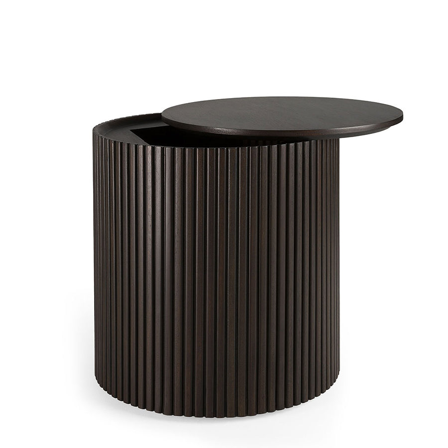 An elegant cylinder shaped sidetable that has hidden storage under its glossy top. Remove the lid to expose a pentagonal shaped inner space to hide clutter away. A beautiful addition made from solid wood in the Roller Max signature stacked wood style. Great attention to detail; made from varnished dark brown tainted Mahogany.