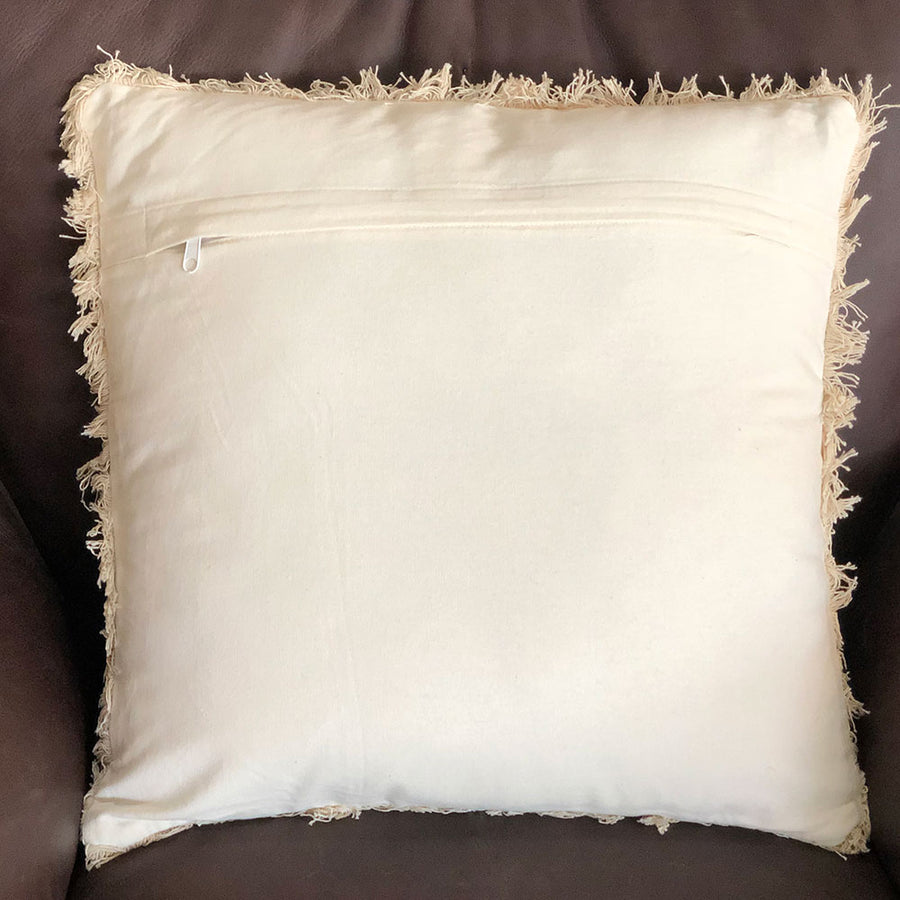 Busy block print patterns in worn blues, blacks, soft peaches and browns give the feel of a travellers find, we love the textural feast made in 100% cotton with decorative braided embroidery in natural cotton and jute, with a natural cotton fringe. A rainbow of thread feature in the decorative border. The back is made in natural unbleached cotton, with a zip closure and comes complete with a fibre inner pad.