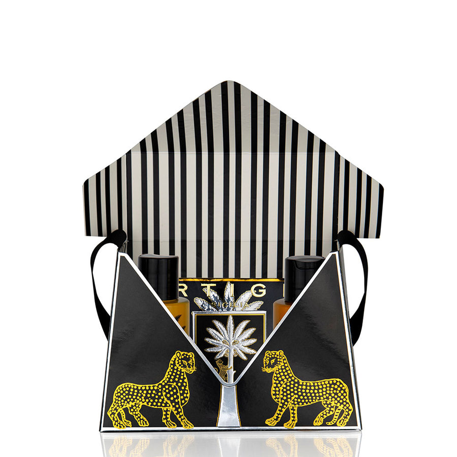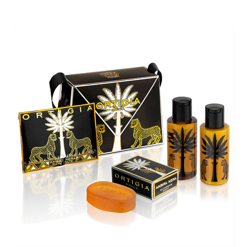 Ambra Nera is an exotic warm fragrance with an amber base of labdanum, oak musk, Galbanum and amber resin. Signature black ornate giftset box, containing Ortigia's natural scented products in miniature, suitable for gifts or travel. Italian style meets the history and magic of Sicily.