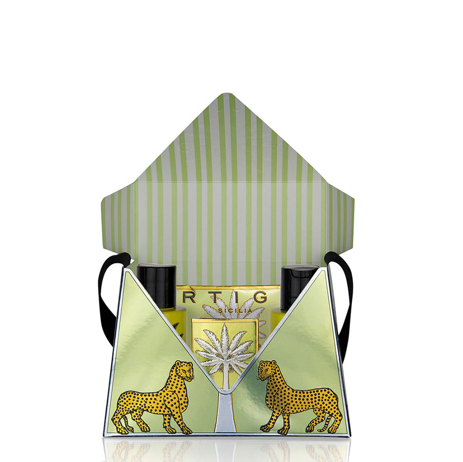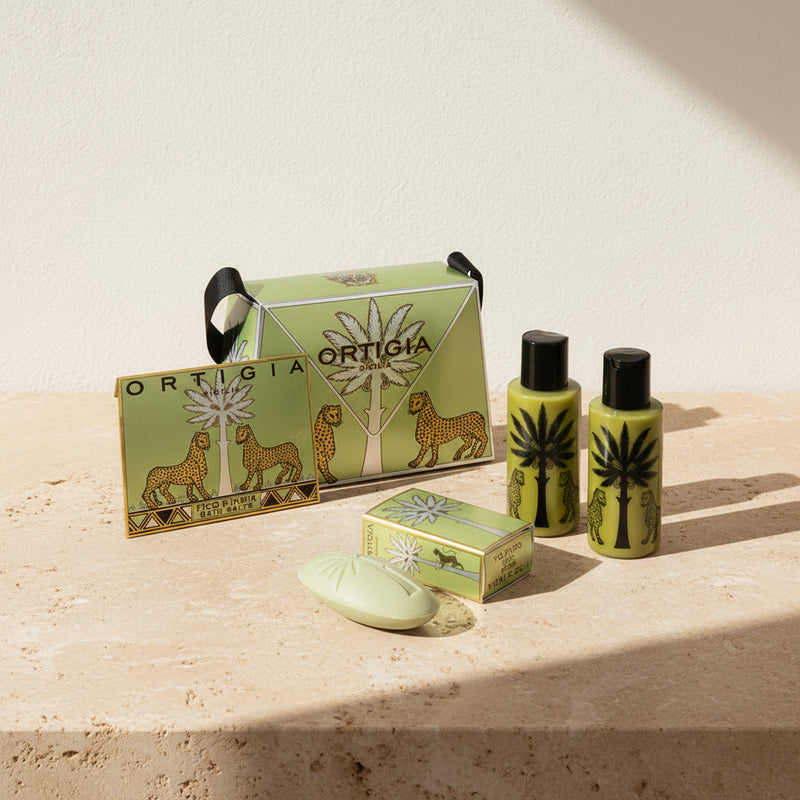 Combining powdery fig and cedar with Fico d'India Cactus on a coconut oil base, this brightly coloured bag contains Ortigia's natural scented products in miniature, suitable for gifts or travel. Italian style meets the history and magic of Sicily.
