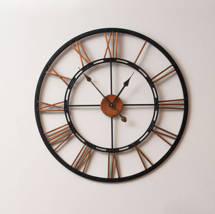 A larger Industrial inspired skeleton wall clock adding a feature to a large wall space.This contemporary clock with its hand-finished black iron frame with copper numbers is perfect for any room. Black minute and hour hands. Hanging hook at top.