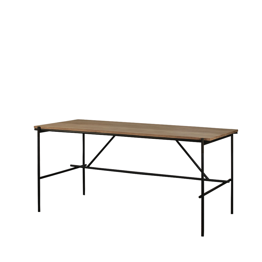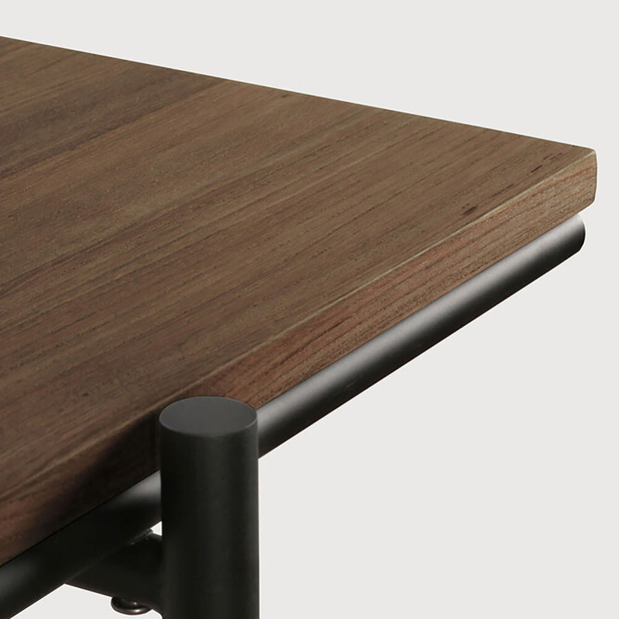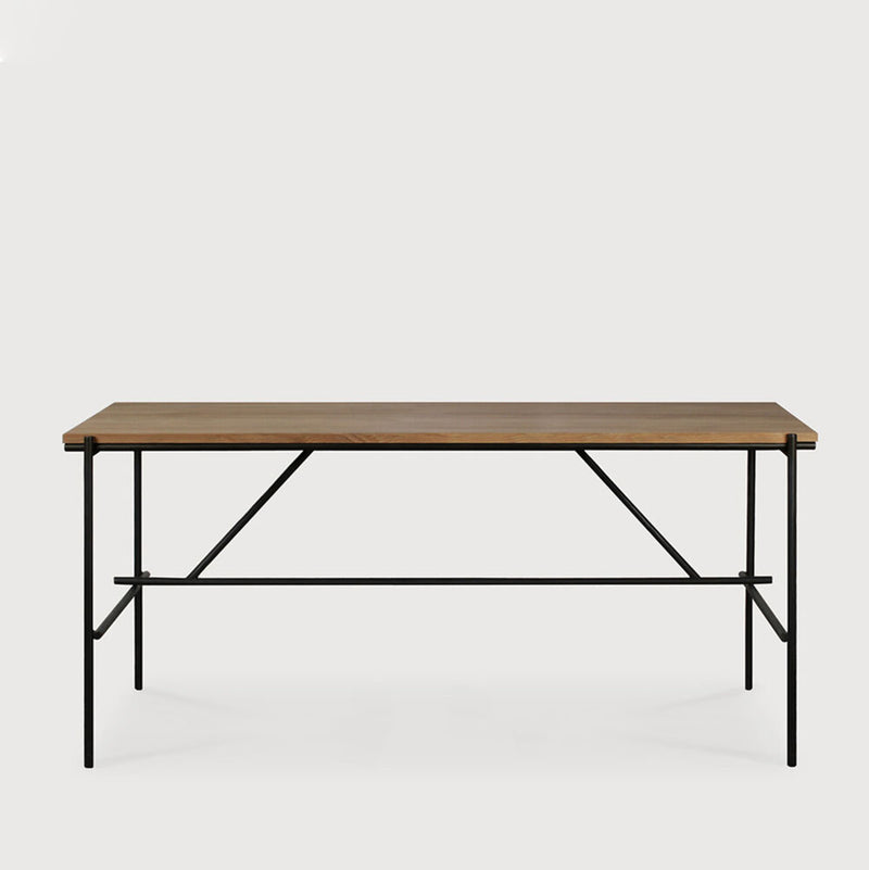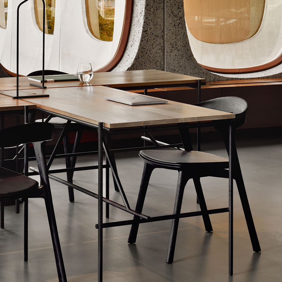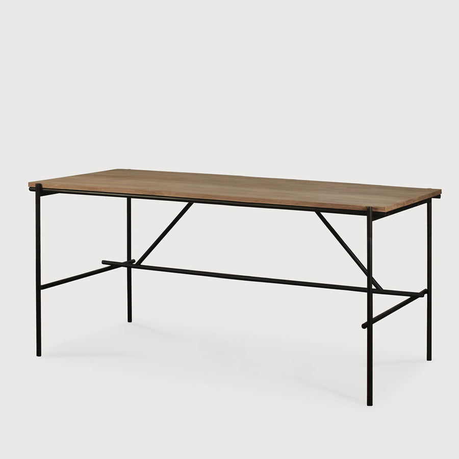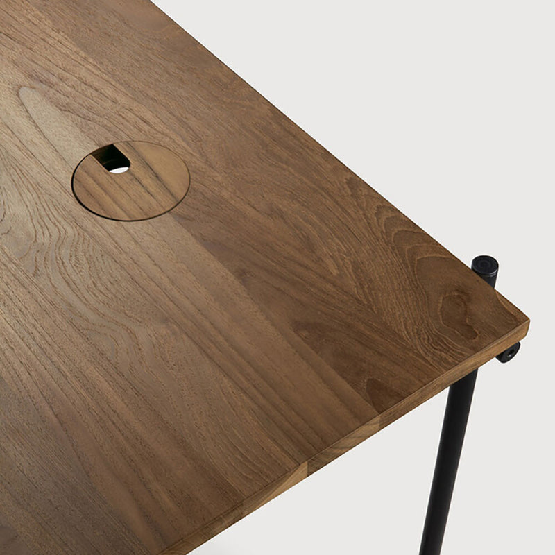 A minimalist black metal frame supports a desktop made from FSC certified solid unfinished Teak. Simple functional design, they will fit flush together to create a bank or row of desks. Available in two sizes and features a cable access point. Designed by Alain van Havre for Ethnicraft Furniture.