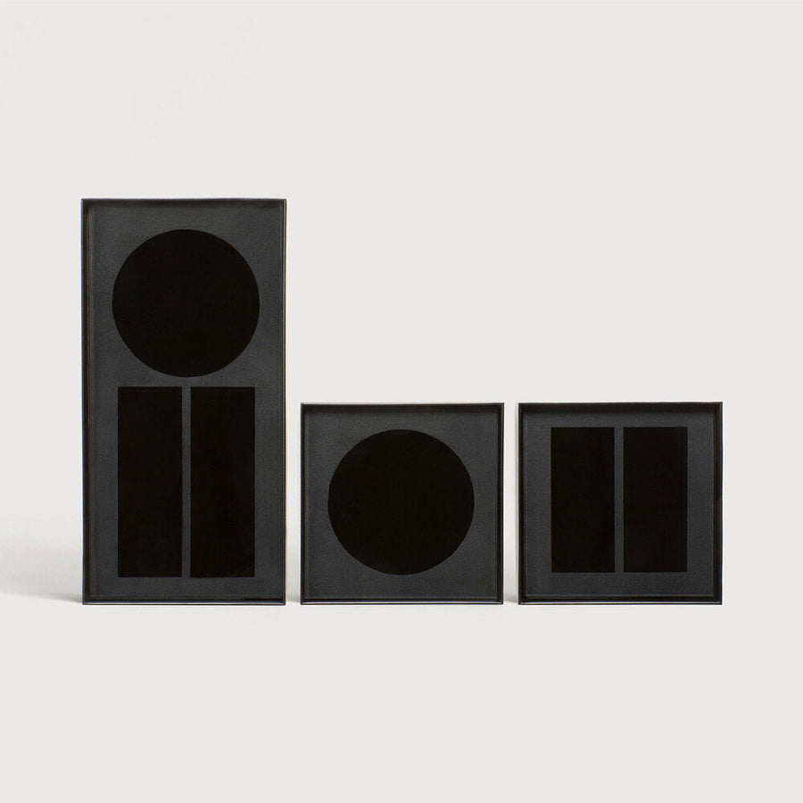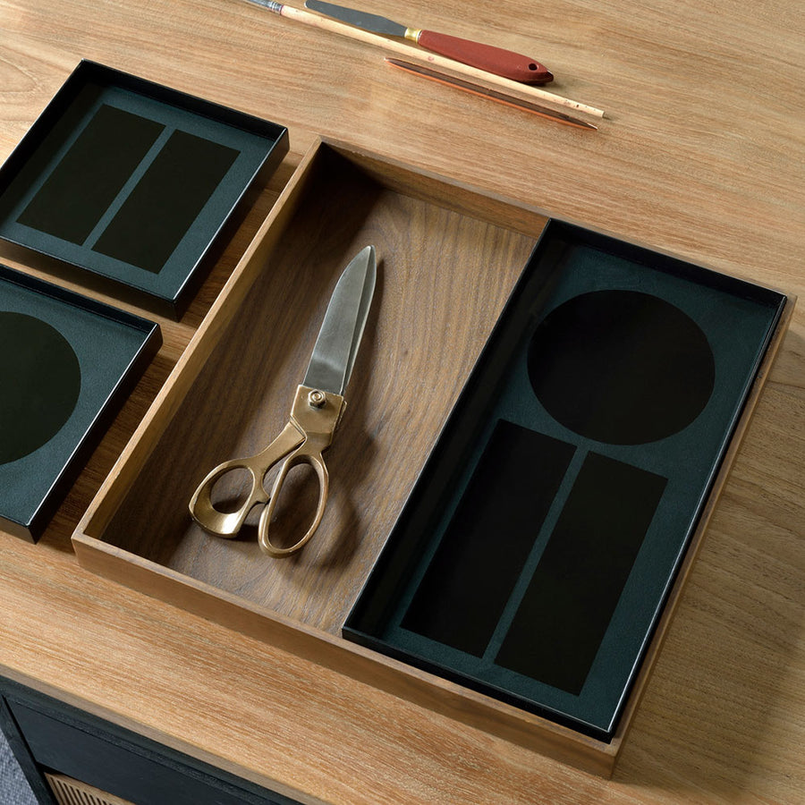 Stylish desk organization at its best. With screen printed graphic charcoal glass within black metal edged trays all housed in a luxurious walnut wood square tray, this four piece desk organizer set offers limitless versatility and functionality. The removable valet trays can be used anywhere in the house as styling pieces as can the walnut square tray. Together they make a beautiful giftset for a office, bedroom or dressing room.