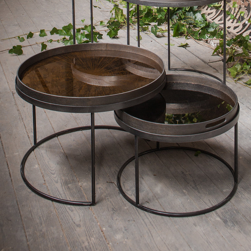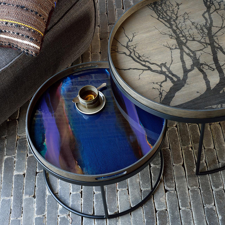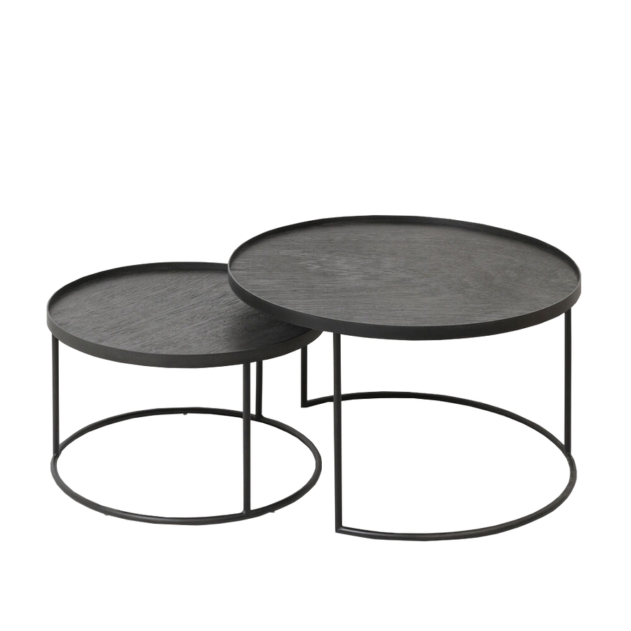 The 'small' table holds the small size tray (with handles) and neatly tucks under the larger 620mm diameter table which holds a large tray (without handles). Make your own look, using one or both trays atop the set.