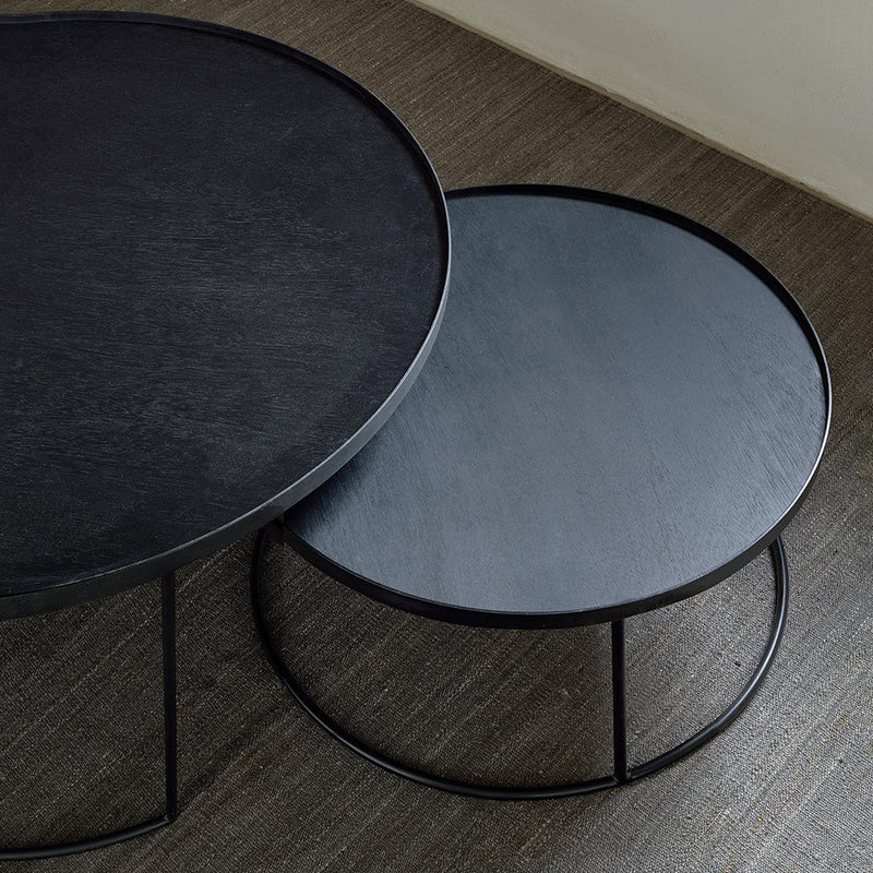 Black metal table frame with round black wood top. Sold as a nesting coffee table set only. Trays are sold separately.
