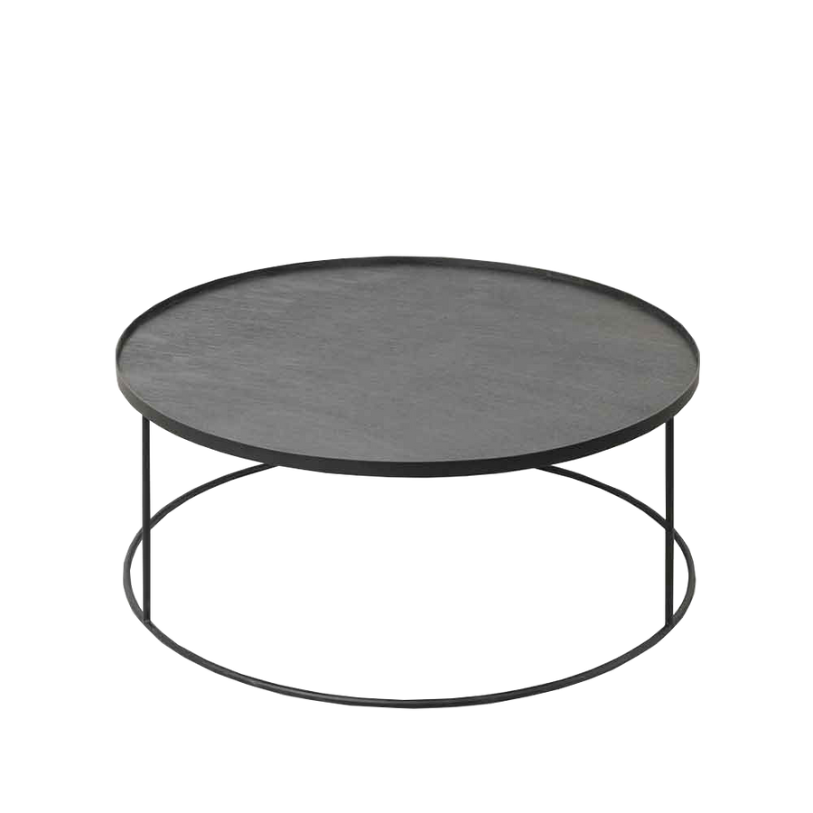 Black metal table frame with round plain black wood top that can hold a tray if so desired. Trays are sold separately - Find your perfect XL tray.