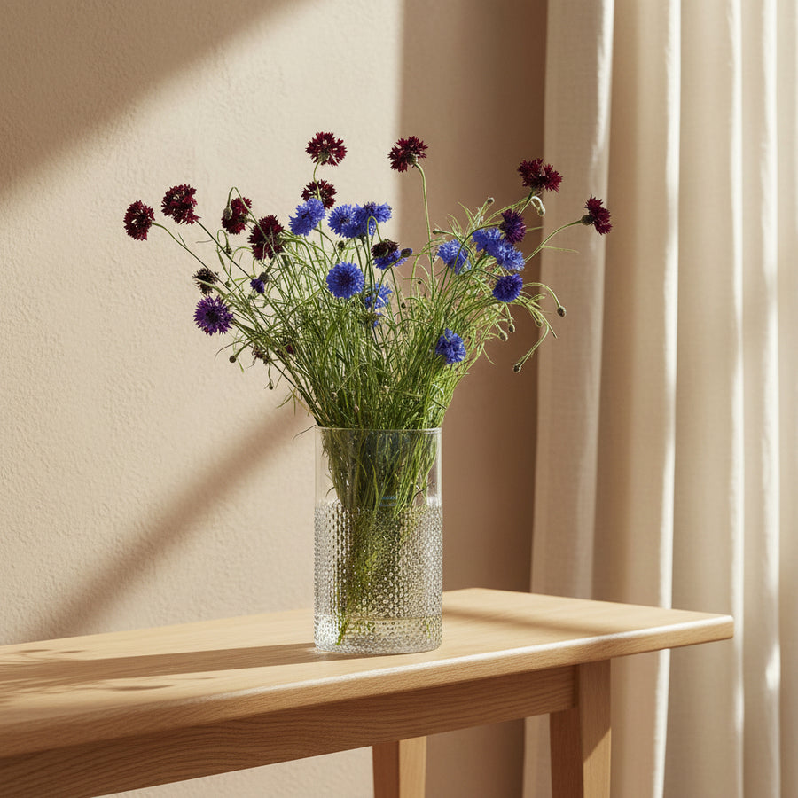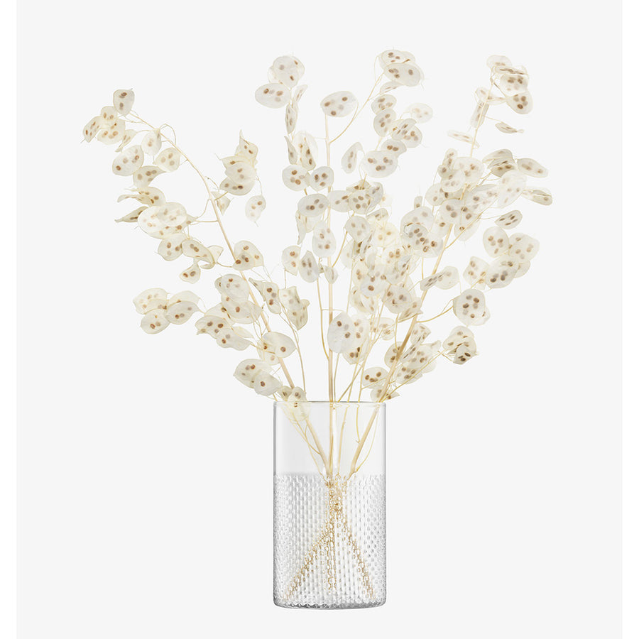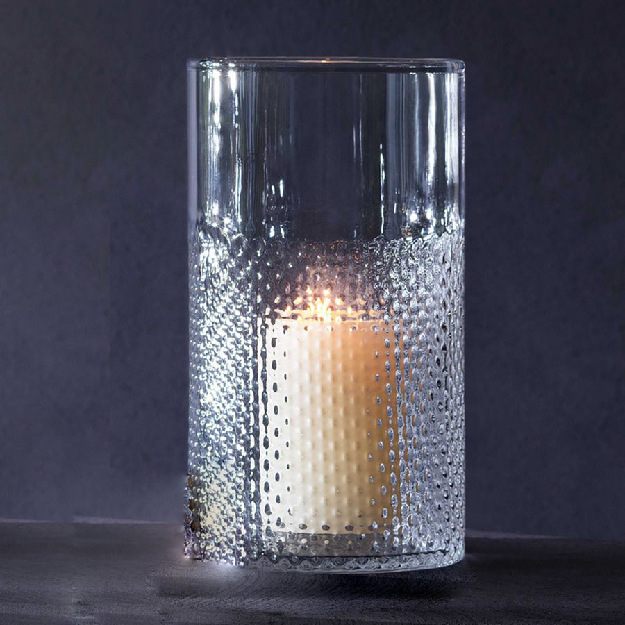 Inspired by woven wicker, this handmade glass lantern has a partially textured wall that helps diffuse your candlelight if used as a hurricane, and adds tactile interest to the arrangement of flowers if used as a vase. Mouth blown by skilled artisans, handwash only.