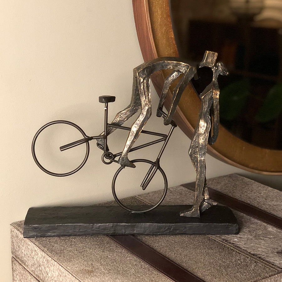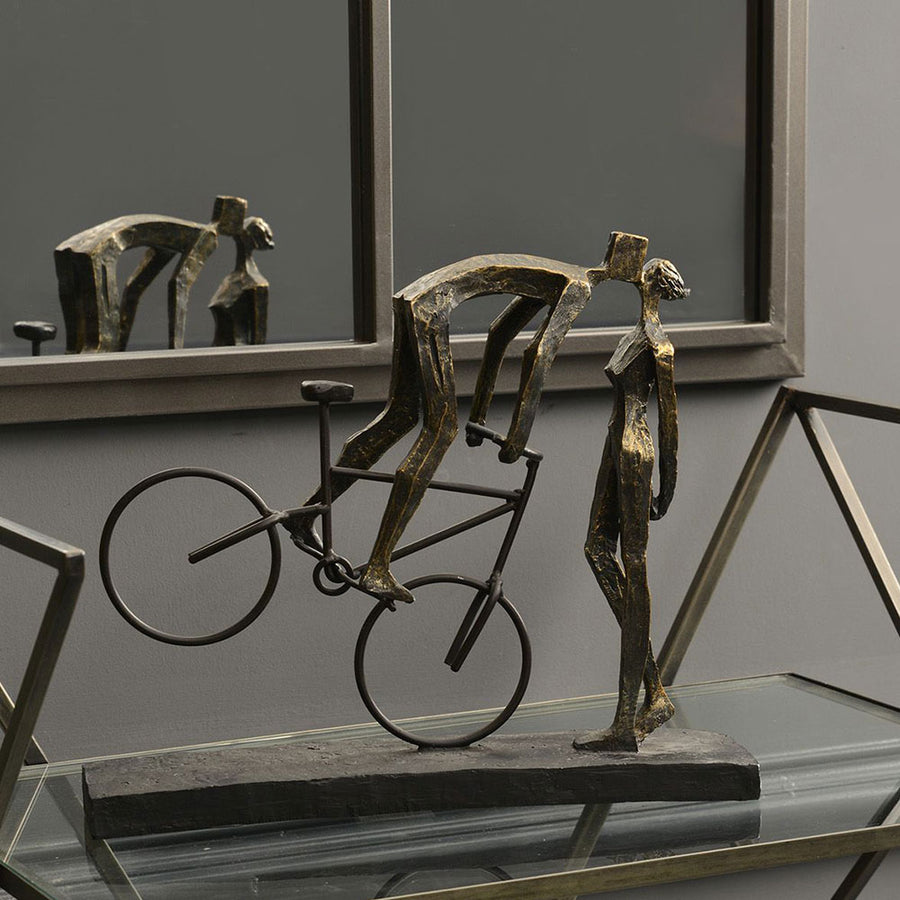 Contemporary sculpture of a kissing couple, him upon his bicycle her standing in front of him. Narrow enough to display at the window or on the mantle. Cast in resin and finished in antique bronze effect with a matt black base.