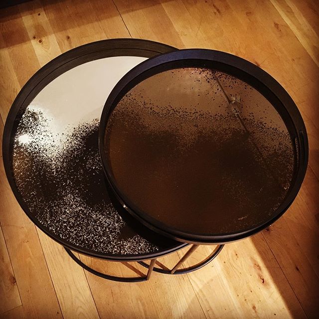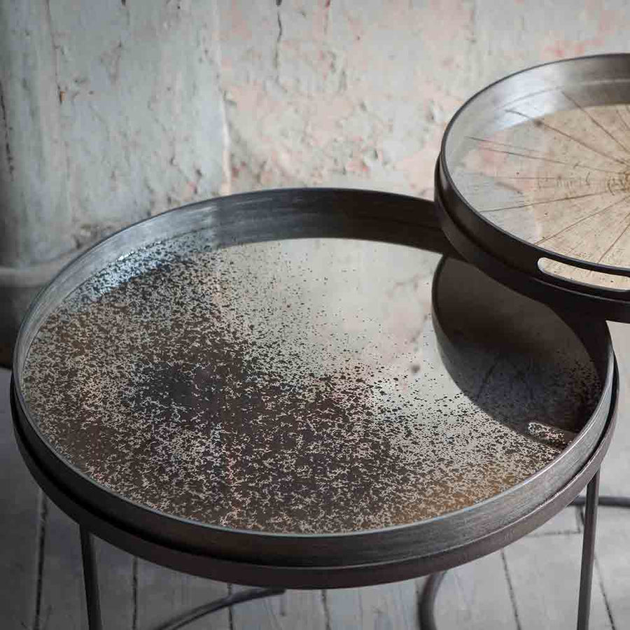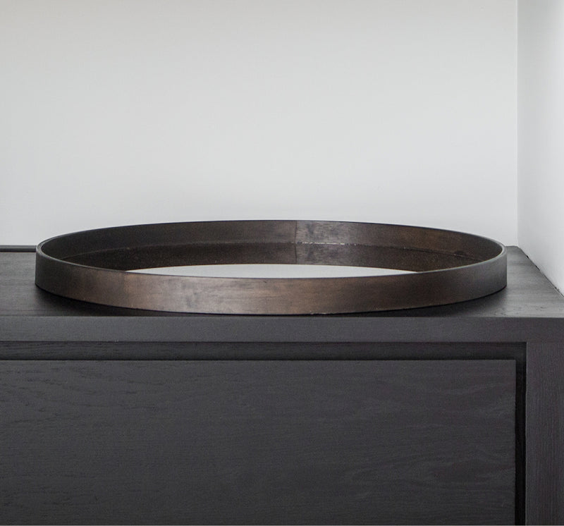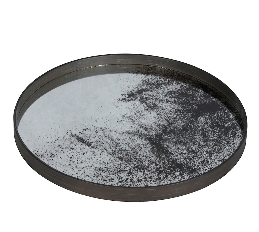 Large mirror tray with contrast dark wood surround and base (no handles), this is a fantastic centre piece. The dark distressing to the clear mirror is hand applied and makes each tray unique.Each item will vary slightly due to the traditional hand-finishing and ageing techniques.