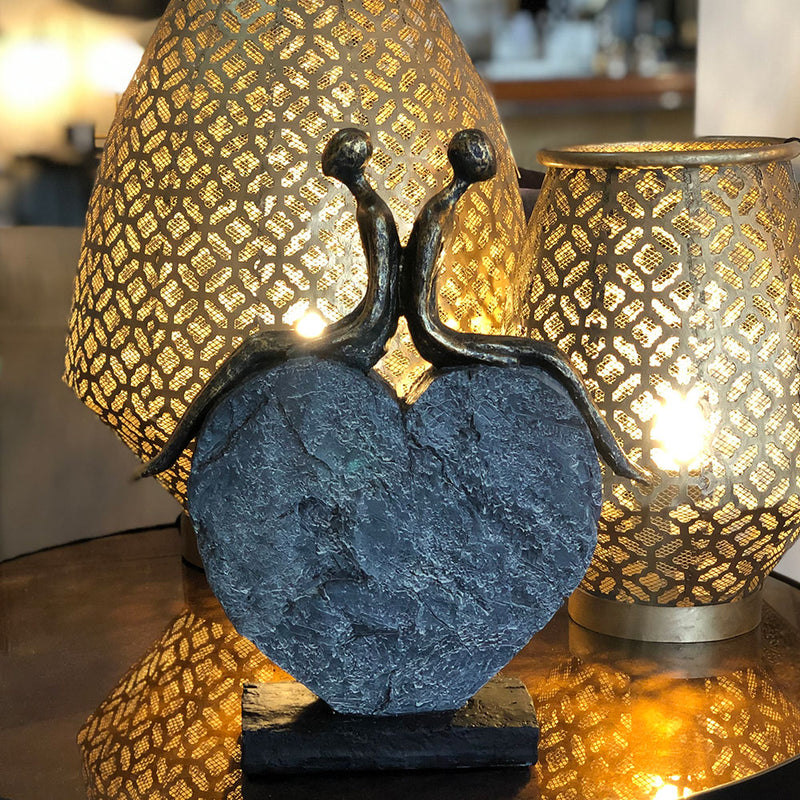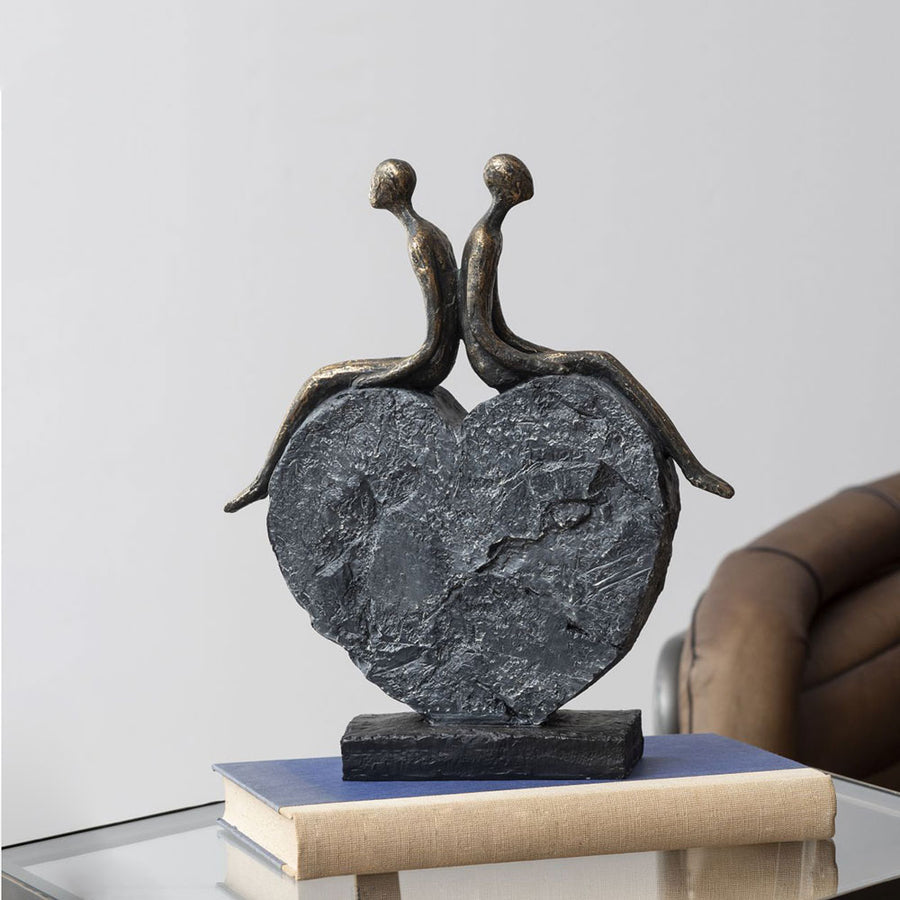 Contemporary sculpture of two figures sitting atop an abstract heart. Seated back to back, this makes a great gift for engagements, weddings and anniversaries, it captures a loving moment of repose. Resin piece with a stone finished heart and an antique bronze hand finish to the couple.