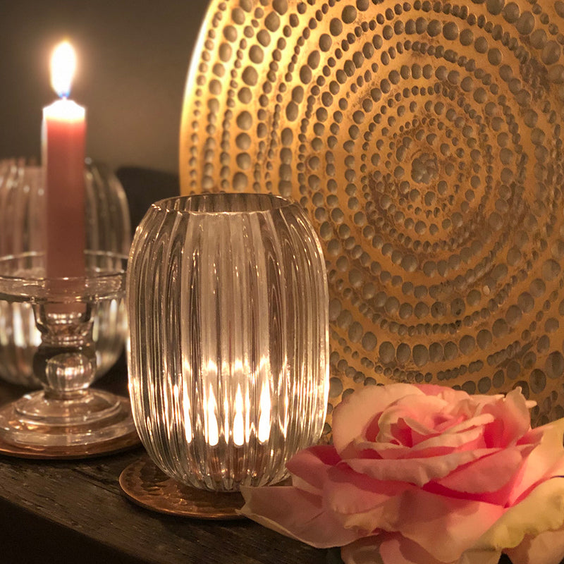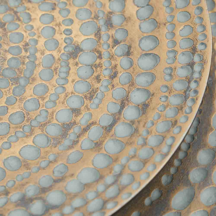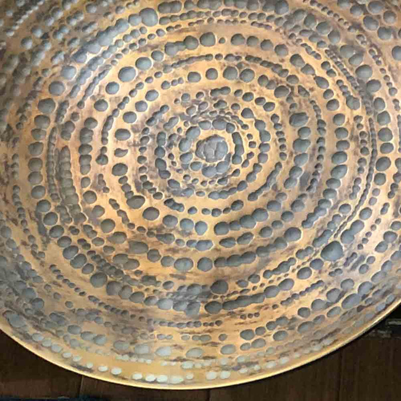 A resin cast decorative plate, hand finished in burnished gold, with a dimpled circular design to its dished front. The verdigris coloured markings have a tribal feel, adding both texture and colour to a wall. The plate has a flat base with pads, meaning it can also be used laying down as a table centre piece. Reverse is black, with a hole receiver for hanging.