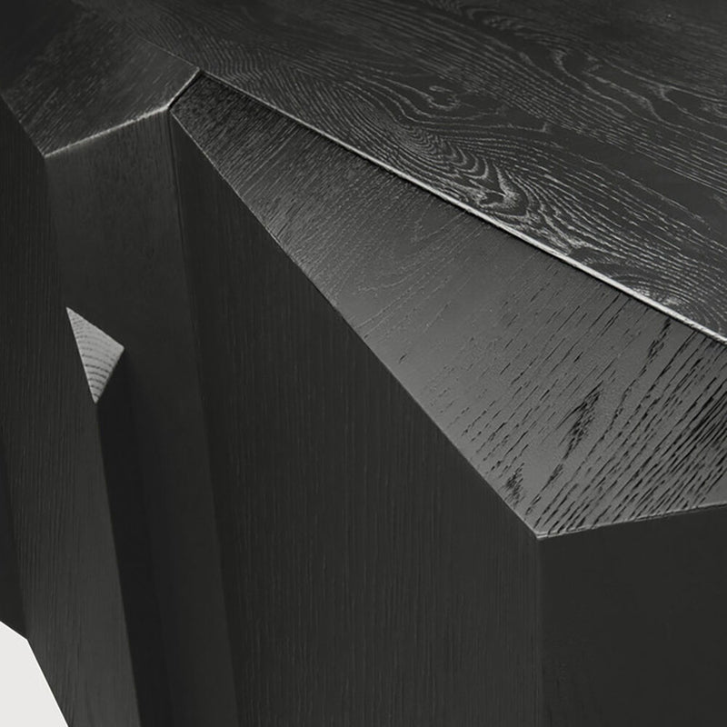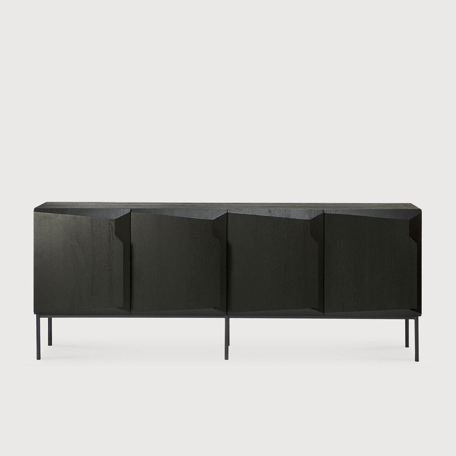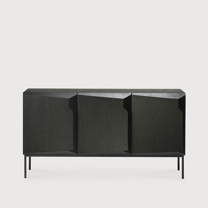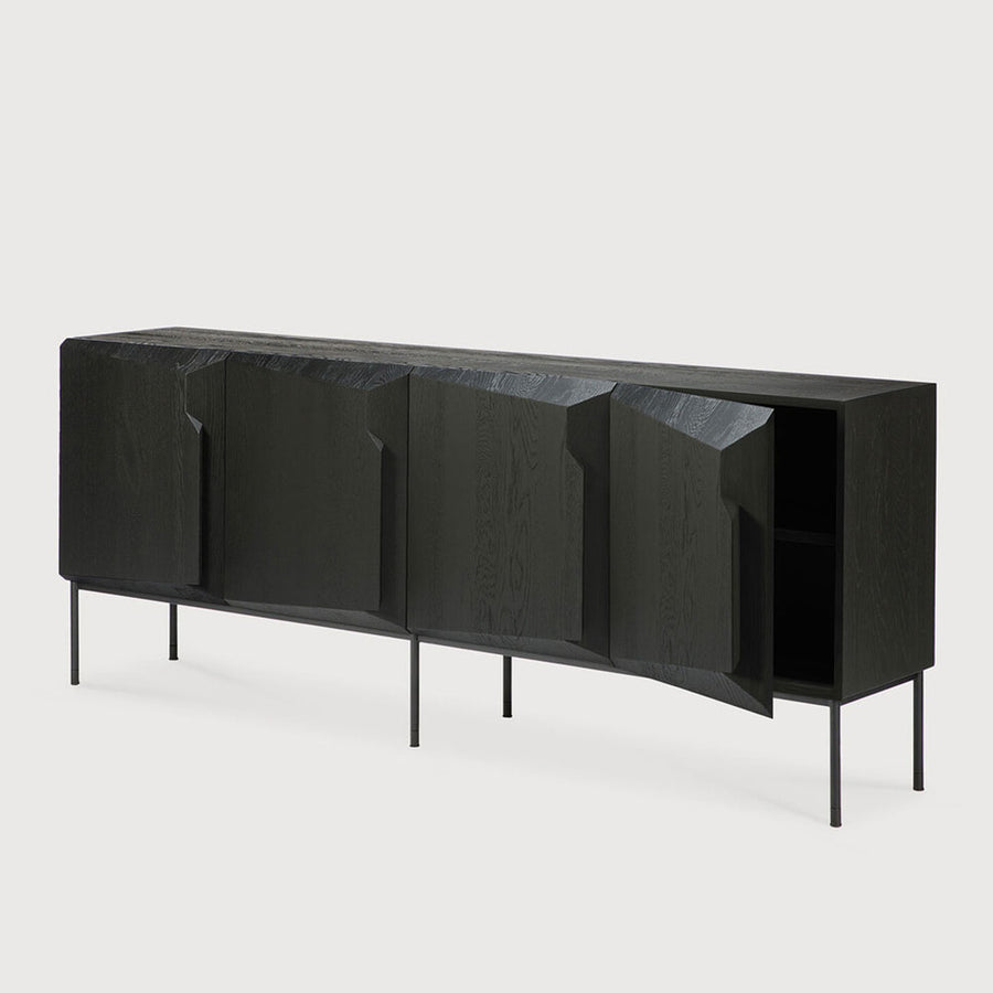 This completely unique contemporary sideboard offers a real statement in your room. All doors are soft close. The black metal frame adds a refined touch to the design which is in itself is a work of art in black tainted oak.