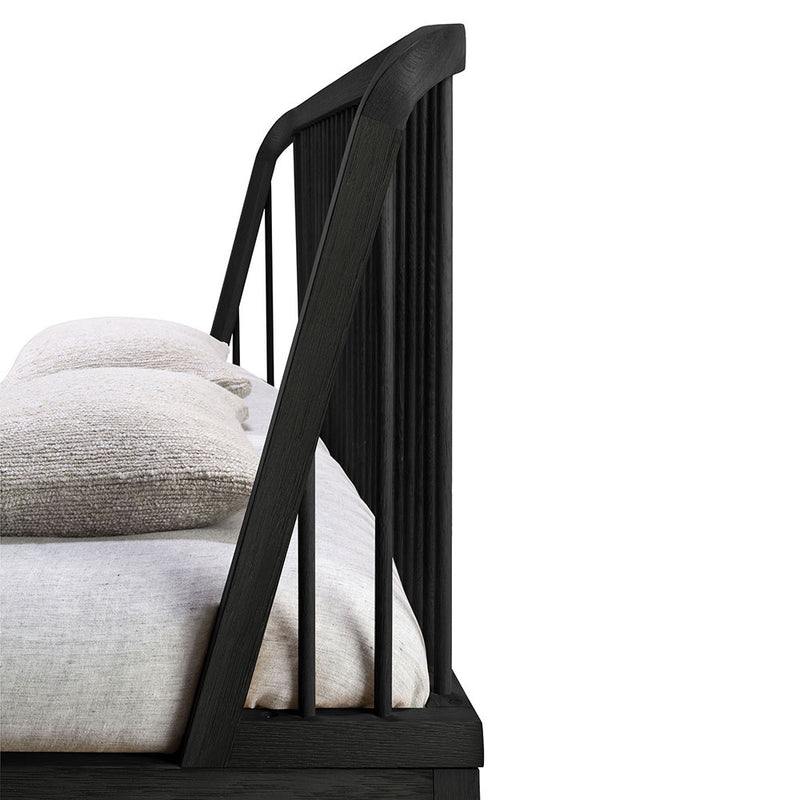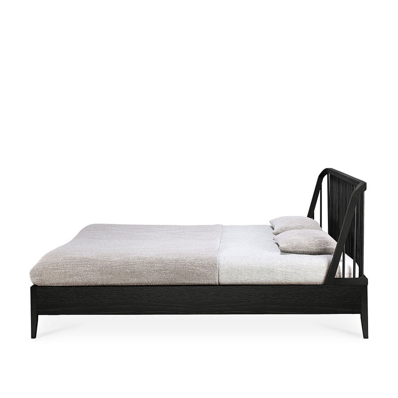 The Spindle collection found its inspiration in the traditional spinning wheel and incorporates perfectly aligned spokes into the headboard. Slightly tapered legs and rounded edges add a soft, sensual quality to this beautiful bedroom collection which combines traditional carpentry with contemporary design. Made from black tainted solid oak. Solid wooden base slats included as standard, or upgrade to a luxury sprung slatted base.