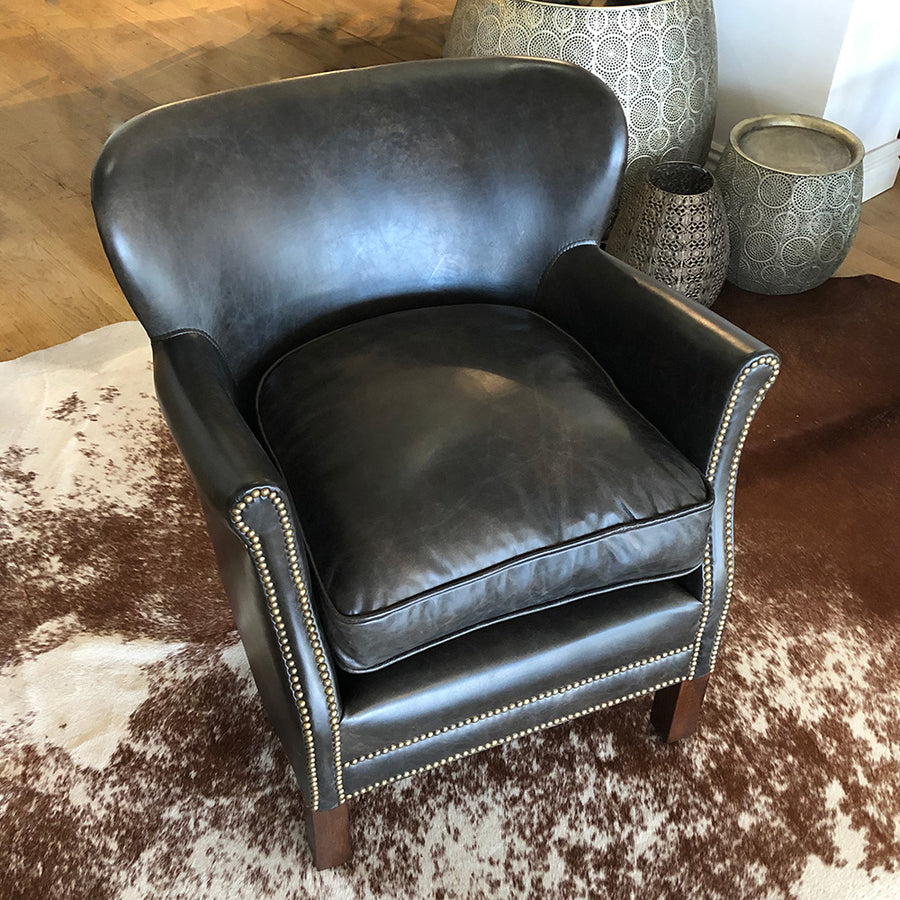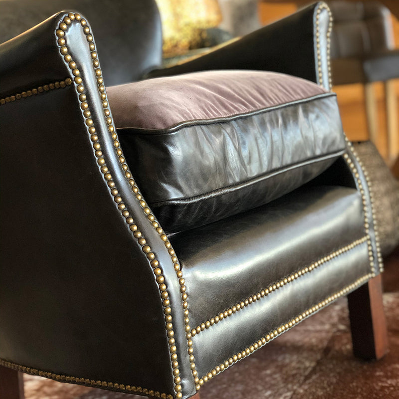 This fine leather armchair is petite in size, making a fabulous addition to a cosy corner or reading nook. All leather with a deep reversible seat pad - featuring a plush taupe velvet on one side. Antiqued dark brown/black leather finished off with traditional brass studded detailing for some old school vintage class.