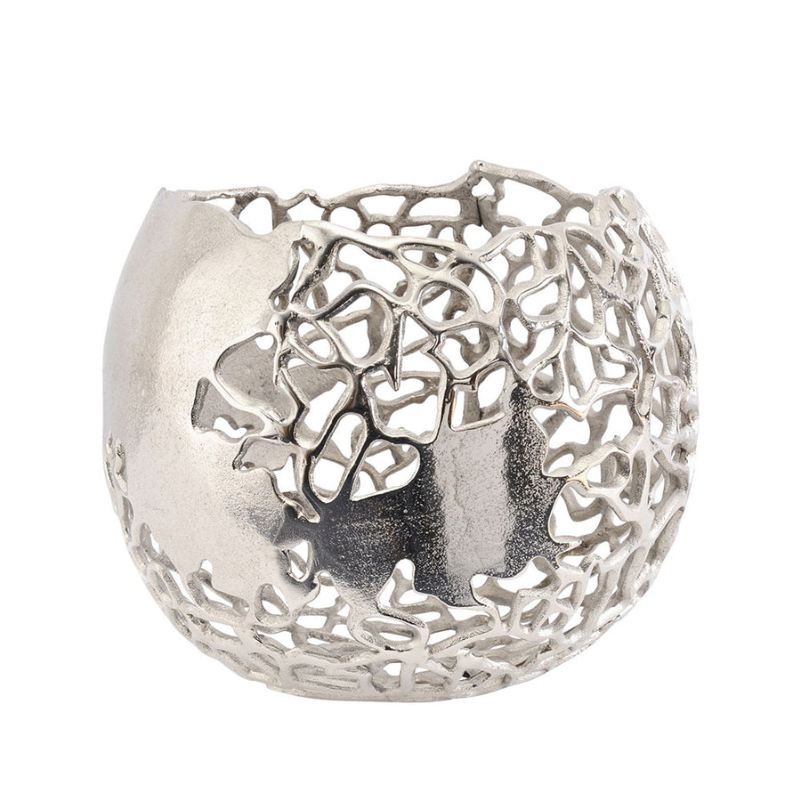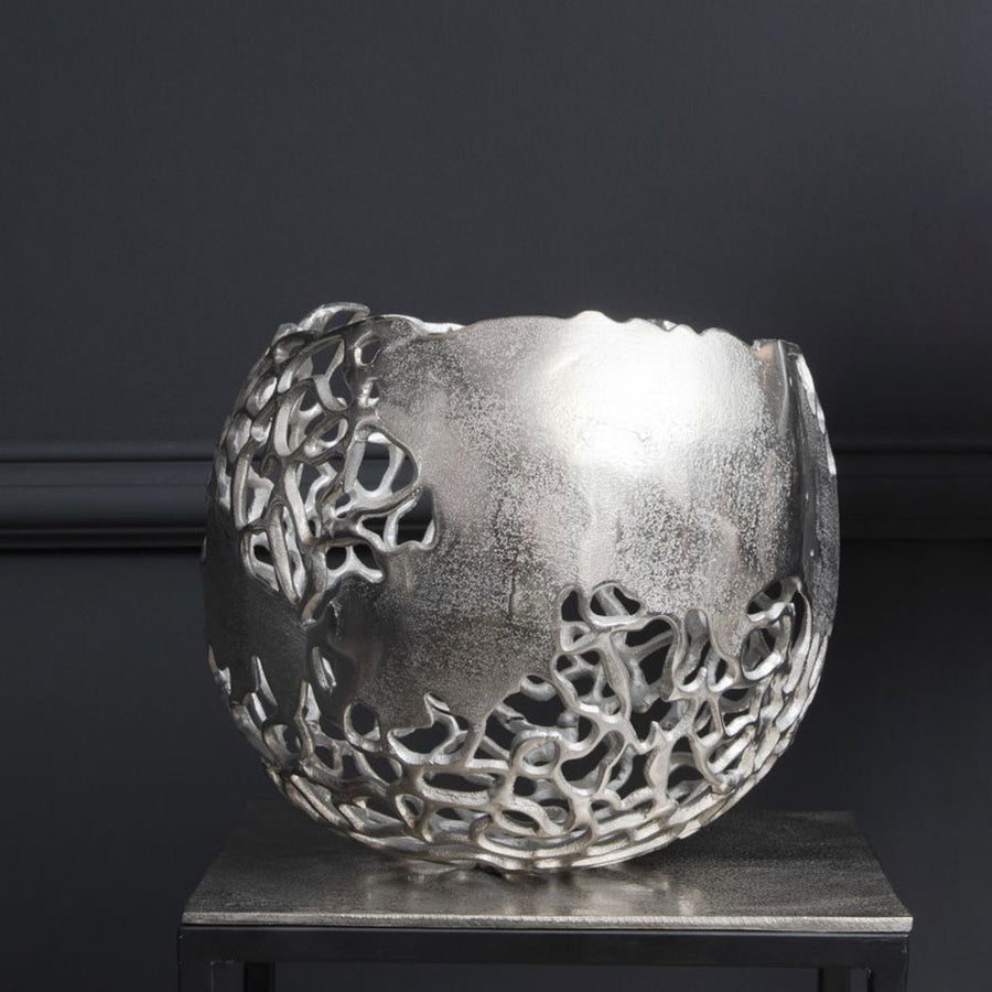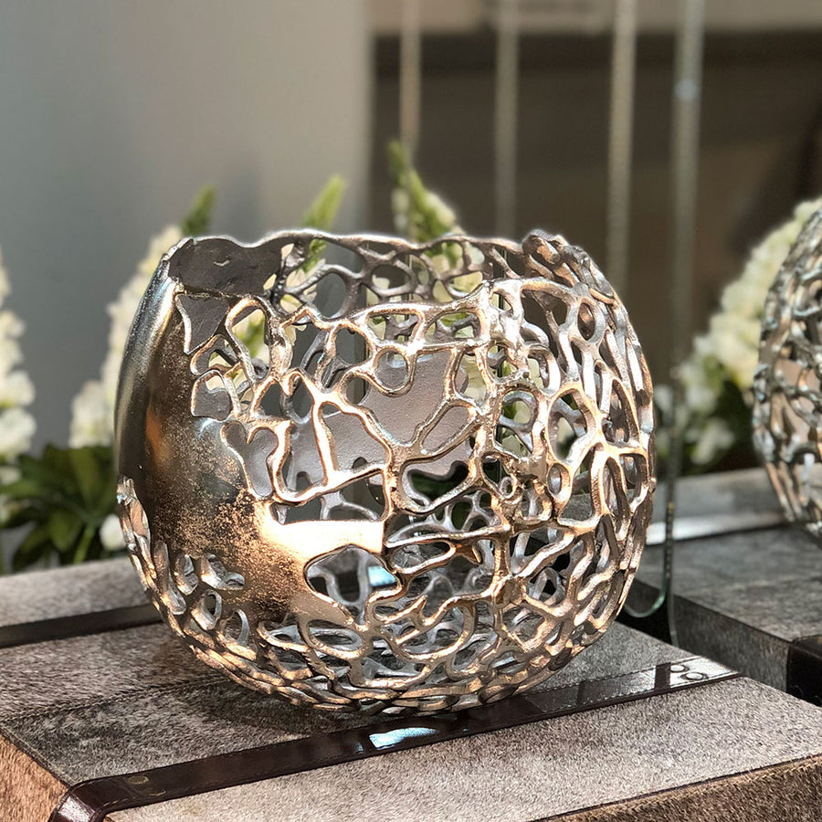 A beautiful raw aluminium vase with ornate open work which makes for a real statement piece for the home. This vase is spherical in shape, use as a dining or coffee table centre piece. Hand Finishing will mean some variance in texture piece to piece