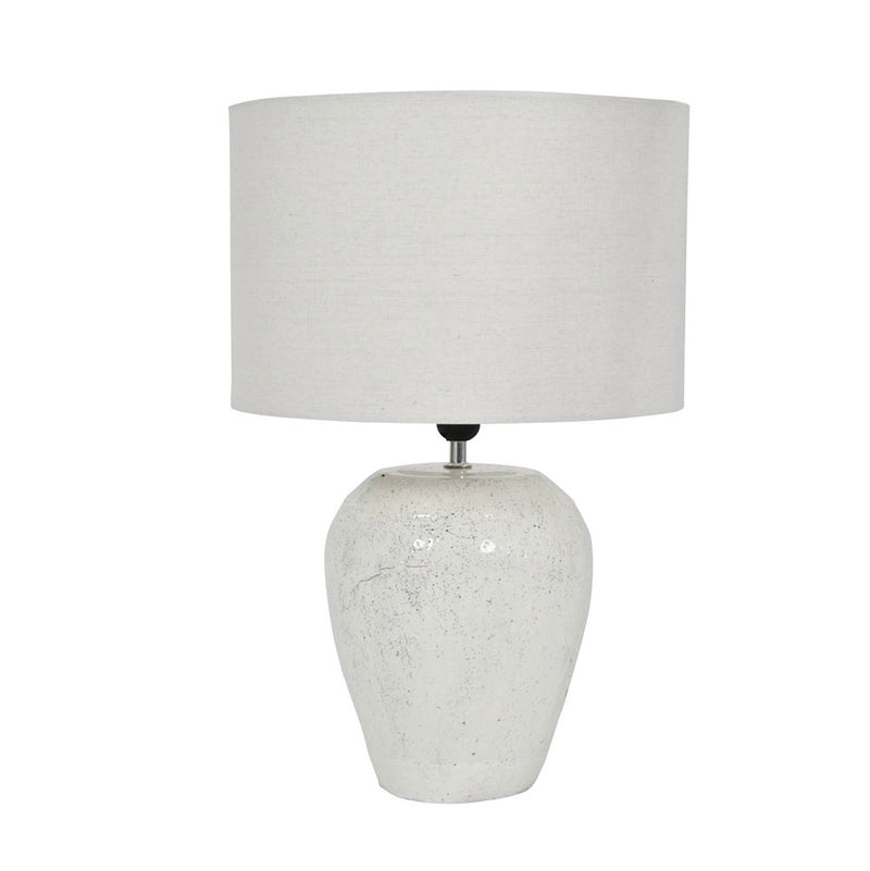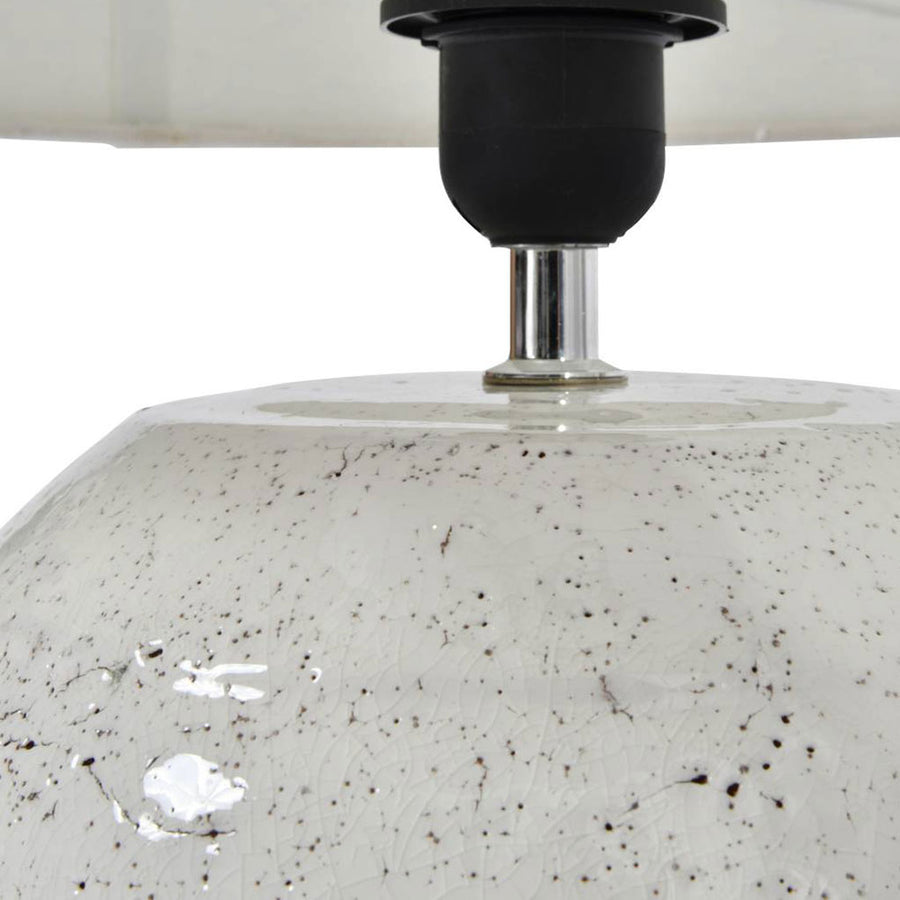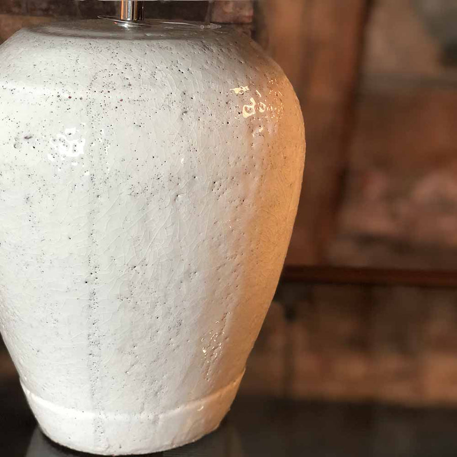 IN-STORE EXCLUSIVE: The Large Crackle Glazed terracotta table Lamp features a white glazed decorative base displaying a special glossy glaze with a textured crackle finish showing dimples of grey and terracotta showing through. This lamp brings soft neutral tones to any room and comes complete with a neutral off white linen shade to finish. Rocker switch on lead.