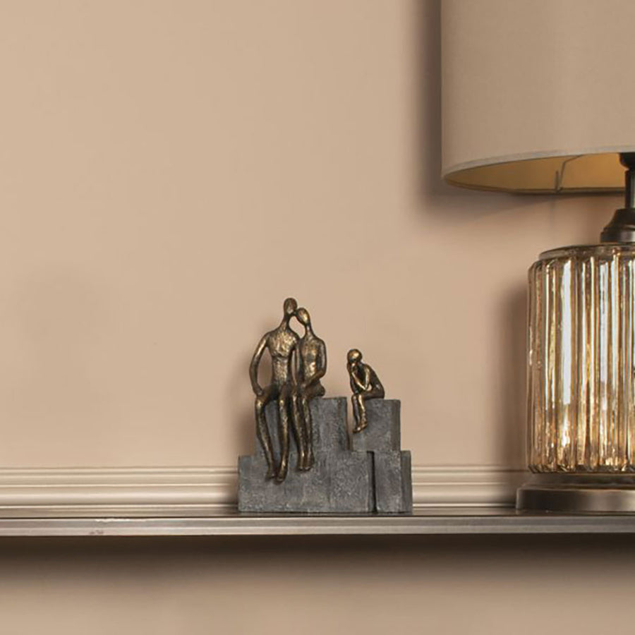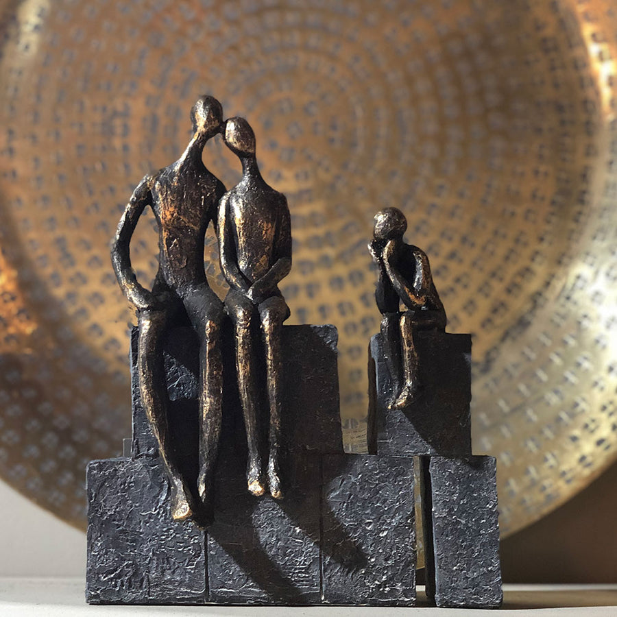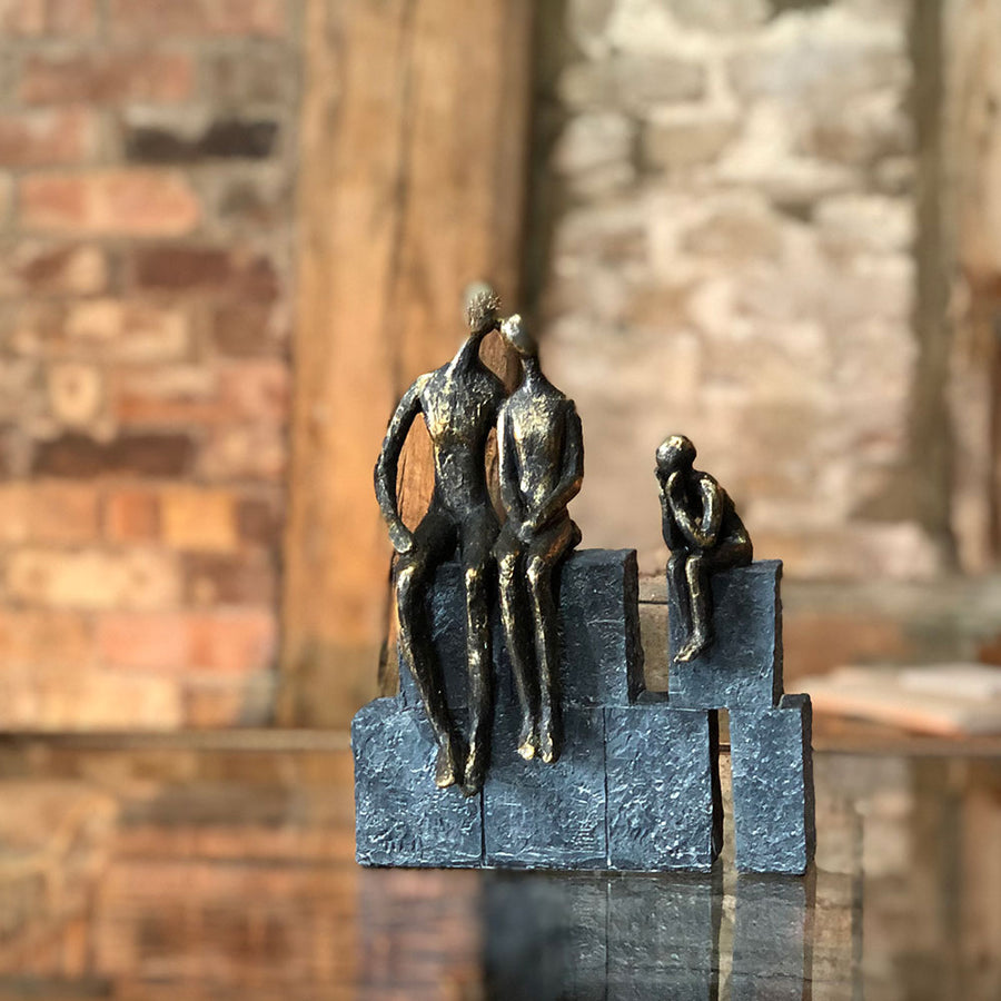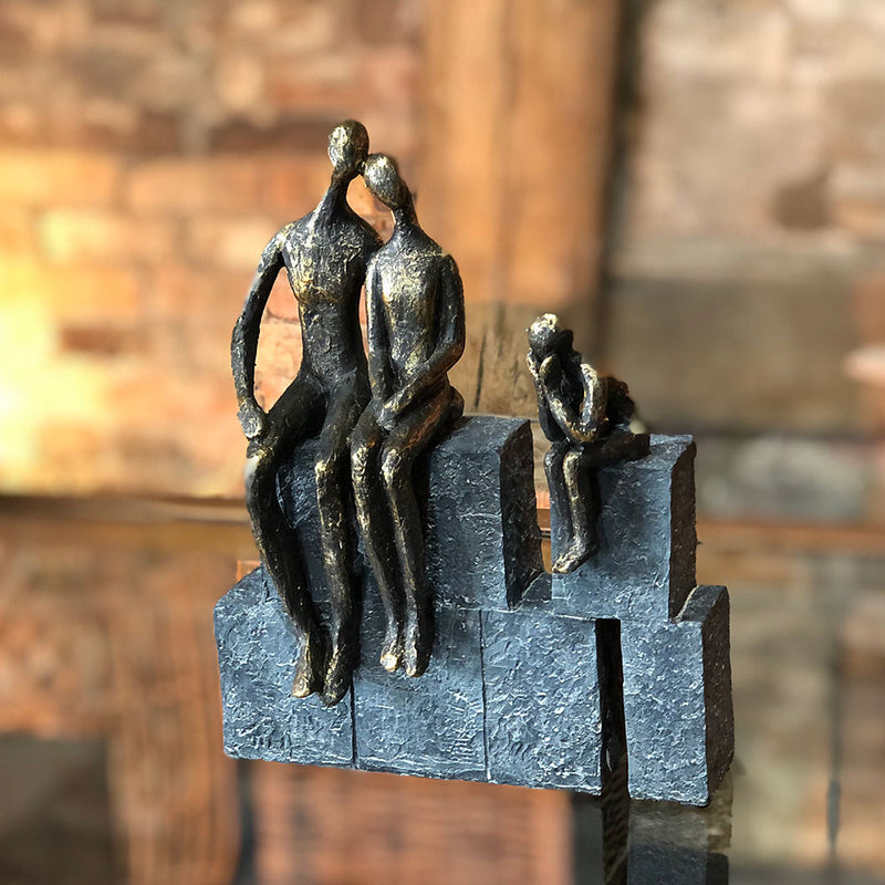 A new sculpture for the ‘our family’ collection, a couple, seated on blocks along with a child looking on at them snuggling up together. A lovely gift for anniversaries, finished in classic antique bronze colour with a dark grey block base.