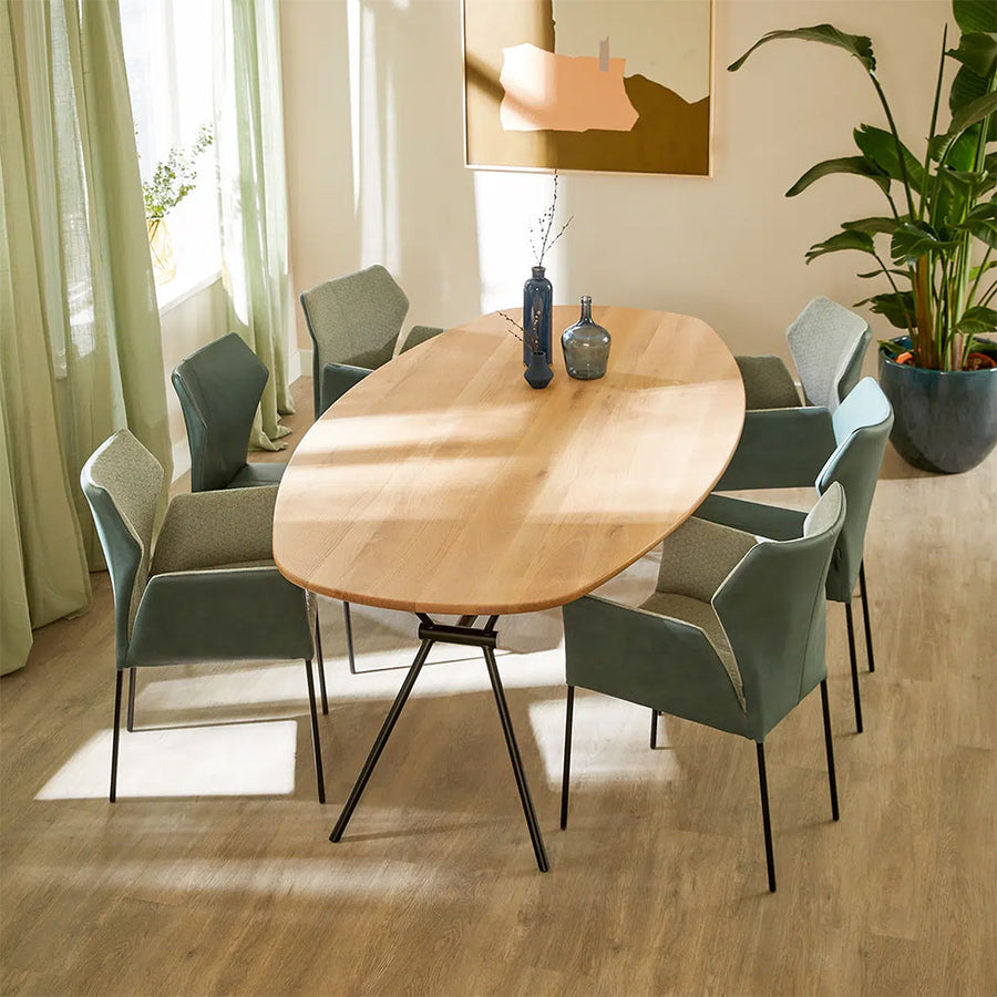 The comfort of this dining room chair is largely due to the shape of the back, which encompasses and supports the curve of your back. In this way, the strong shape also becomes part of the chair's function. It's a great addition to your family table and each chair is made to order so be as daring as you want, choose from a large colour choice of fabric and leather. Metal legs in either steel finish or available in a choice of powder coated colours: Brown, Anthracite, Beige, Black and White.
