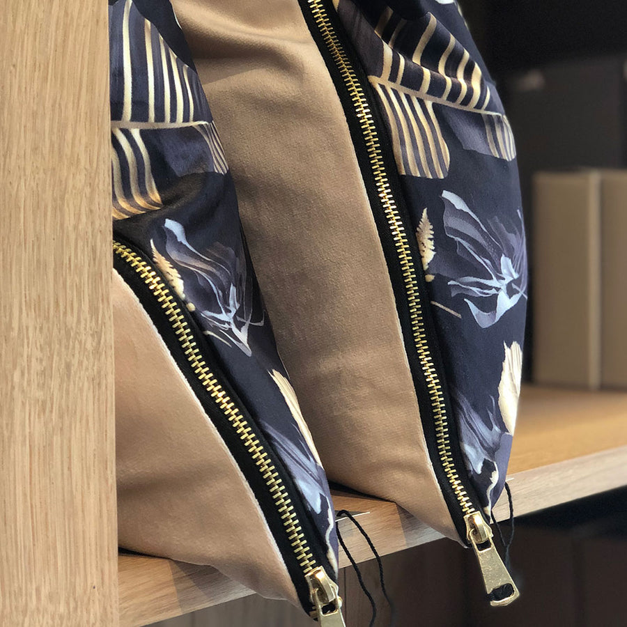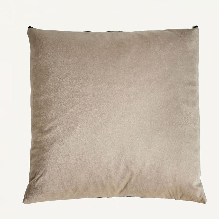 Plain taupe velvet back, feature oversize gold Zip closure, feather inner.