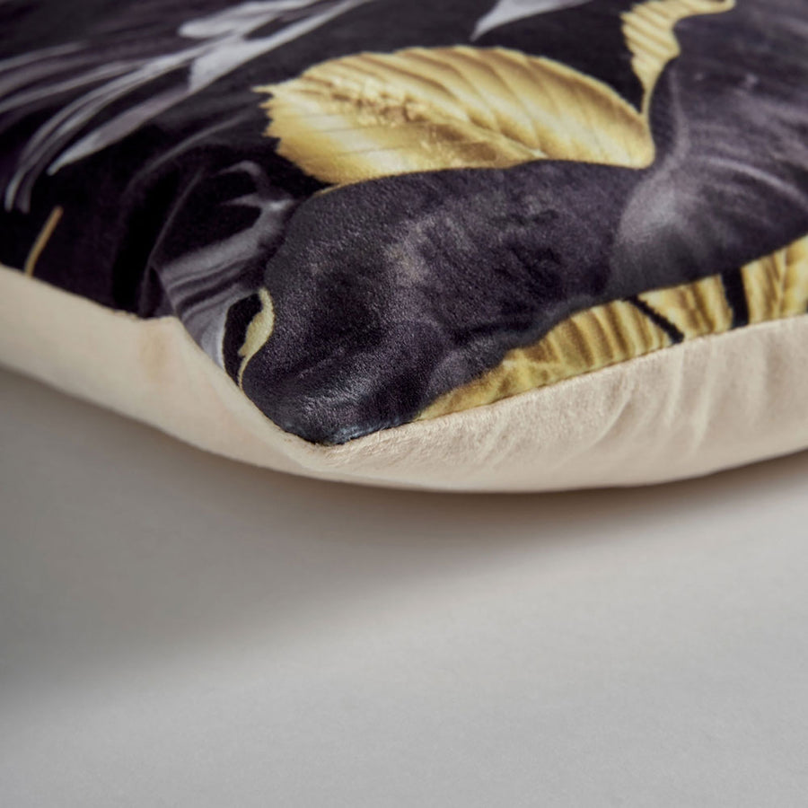 Glamorous gold and black with a maximalist print, this cushion is no shrinking violet. Black velvet featuring a golden foliage