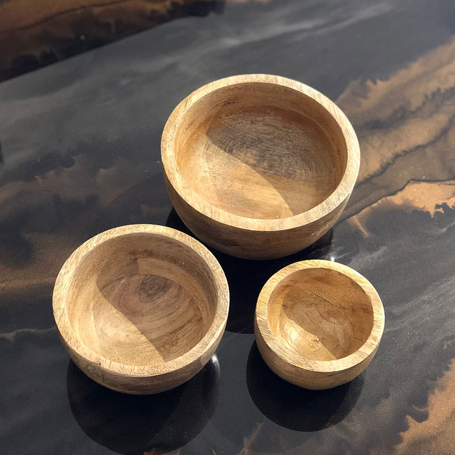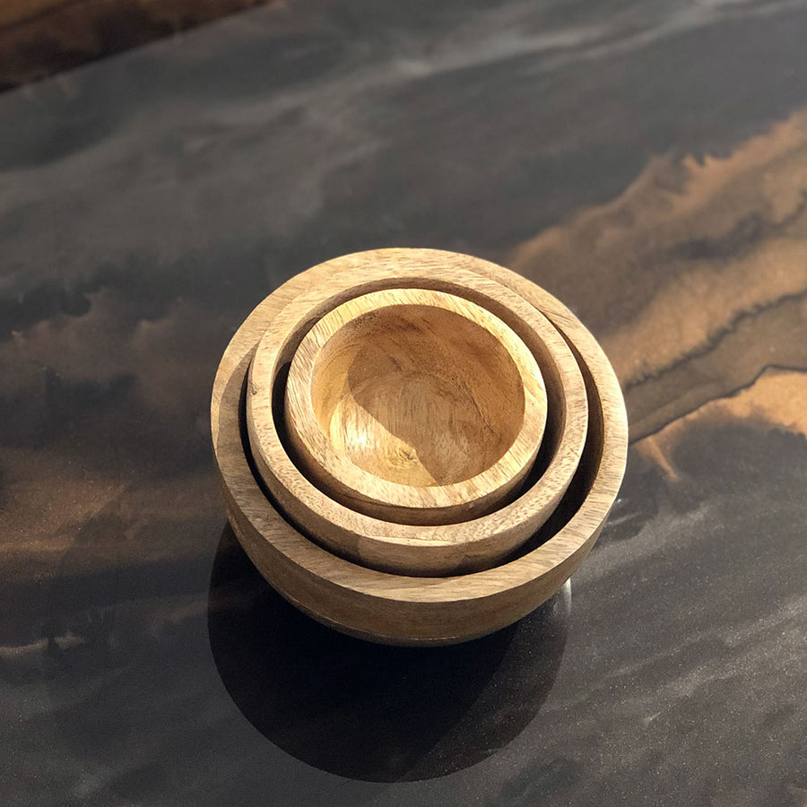 A triple pack of small serving bowls designed for dry snacks and sides; crisps, nuts, sprinkles and sweets. Made from sustainable Mangowood displaying beautiful grained patterns that make each piece unique. Contains a set of three sizes that stack into each other for storage, the largest of which is 15cm diameter and 7cm high. Hand wash and dry thoroughly-do not soak wood.