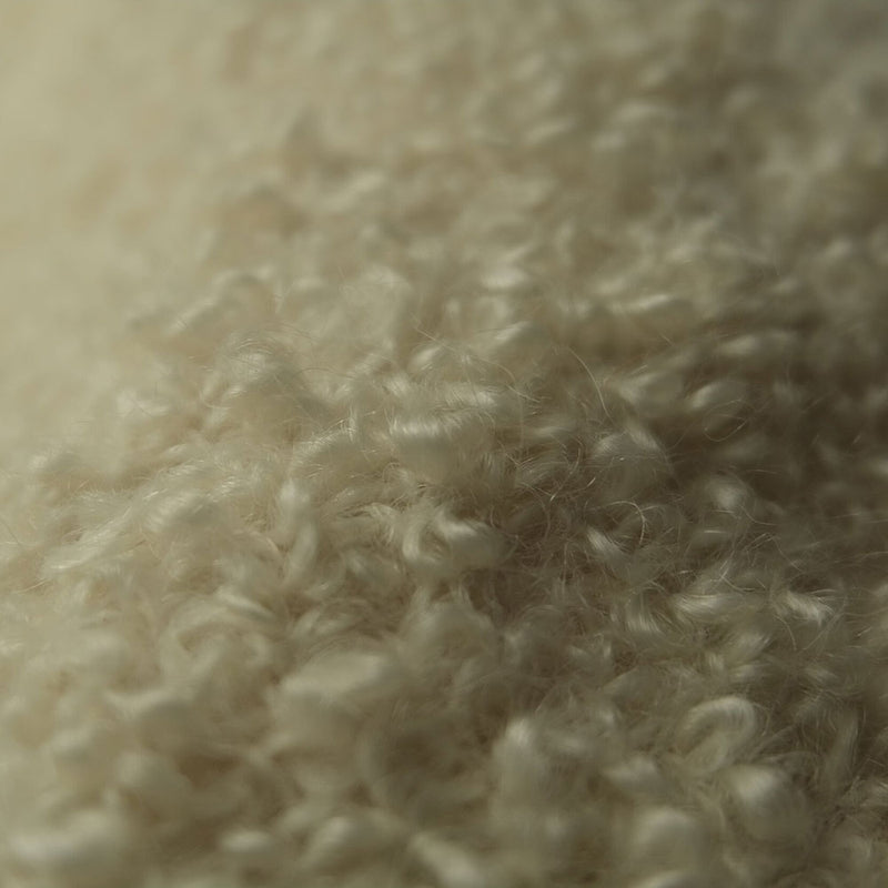 Traditionally manufactured in Scotland, combining British design, manufacture and craftsmanship with luxurious Mohair from pure bred Angora goats.  Coveted for its inflammability elasticity durability and distinctive sheen. The rare and difficult bouclé design traps warmth in its curls and adds tactile texture, this large and luxurious cushion is backed with traditionally made and woven graphite-grey wool from Hebridean Sheep. Wool filling to the cushion inner. Due to its handmade nature sizes will differ slightly piece to piece. 100% Silk Shear Rock Signature tag.