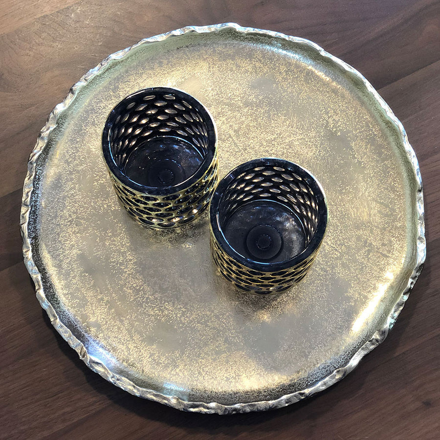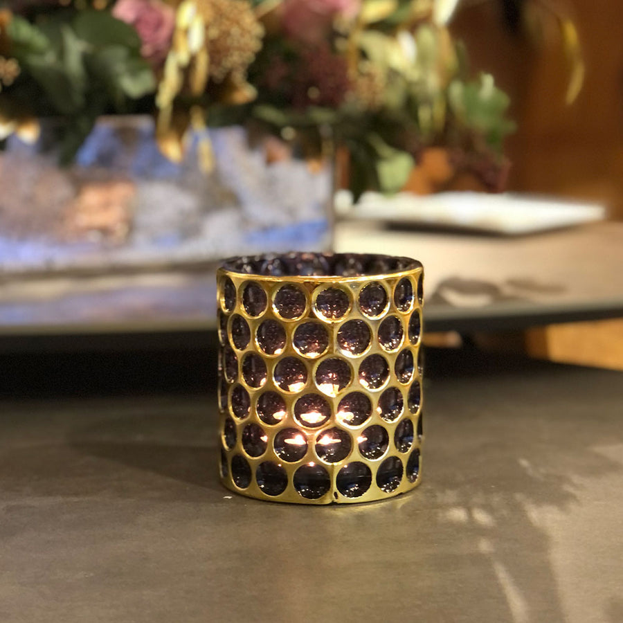 Gorgeous light shines through the little windows when you place a lit tealight inside. This dark blue/grey glass votive, with a gold coloured outer adds a dash elegance to a dinner table.